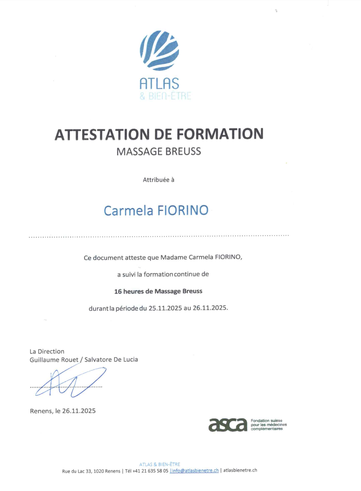 Le massage Breuss, créé par Rudolf Breuss, est un massage énergétique doux de la colonne vertébrale, pratiqué avec de l’huile de millepertuis magnétisée. Par des mouvements lents et enveloppants, il libère les tensions profondes, relance la circulation énergétique et favorise la régénération des disques intervertébraux. Le magnétisme renforce l’action harmonisante sur le corps et l’esprit.